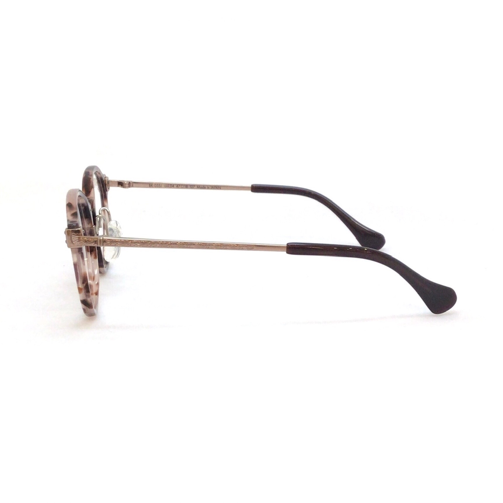 丸い形が苦手でも選びやすいボストンタイプのコンビネーションフレームです。 桃色のべっ甲柄が柔らかな印象の可愛らしいモデルです。