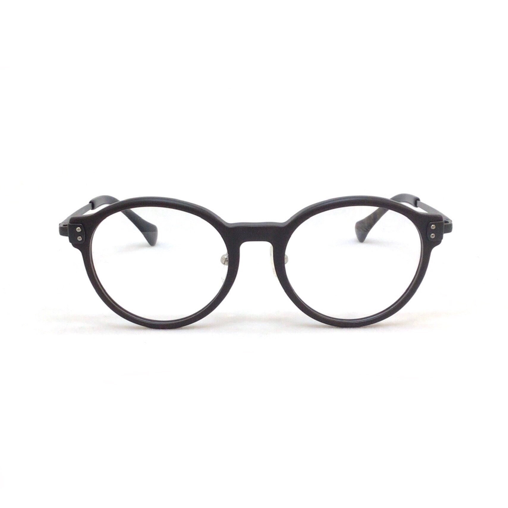 丸い形が苦手でも選びやすいボストンタイプのコンビネーションフレームです。 限りなく黒に近いブラウンにマット加工が施されたチョコレートカラーが可愛らしいモデルです。