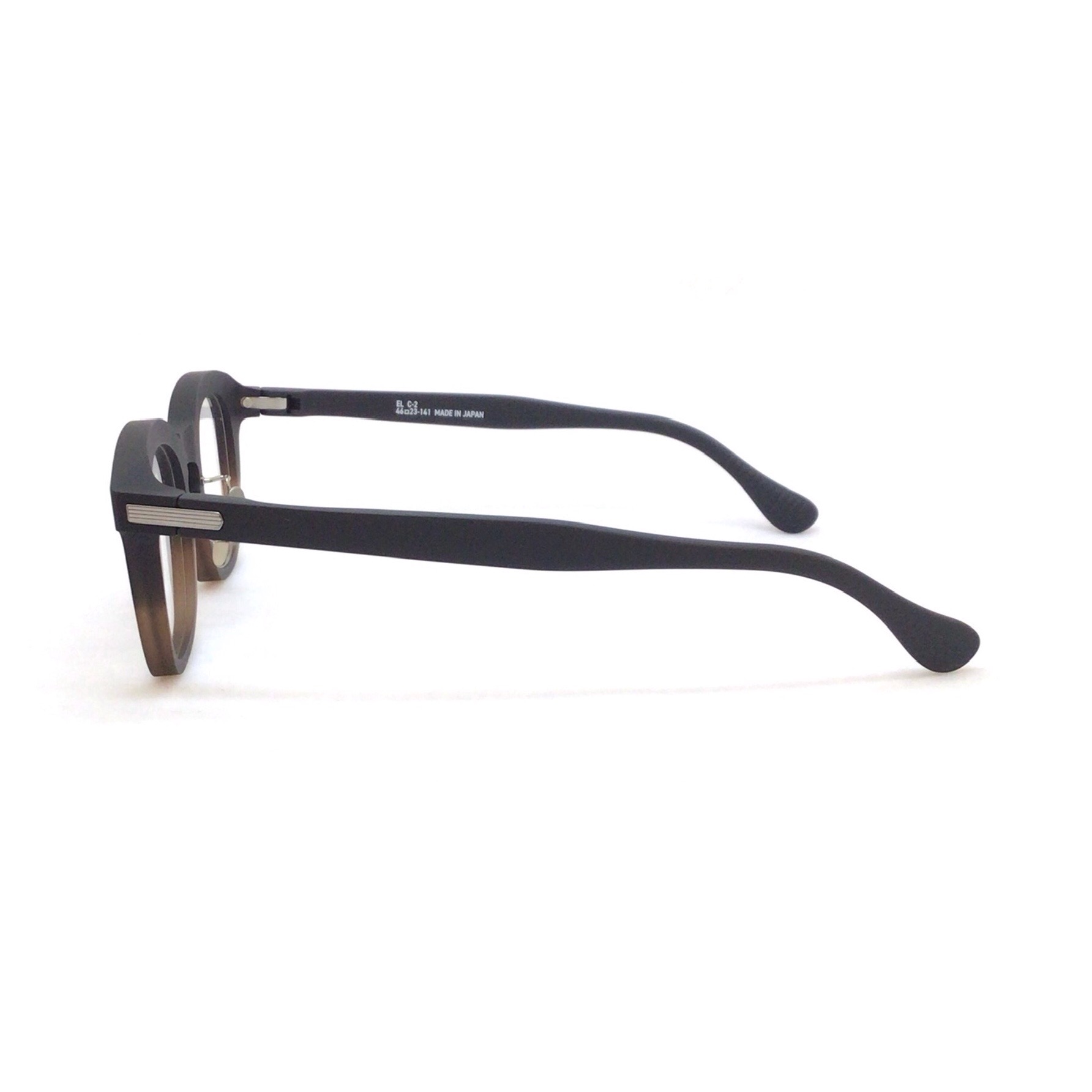 落ち着いたツートンカラーのウェリントンタイプのフレームです。 カーブのあるブローラインや下向きに弧を描いたようなエッジの効いたブリッジラインが特徴的なモデルです。 キーホールブリッジがクラシックな印象をプラスしています。
