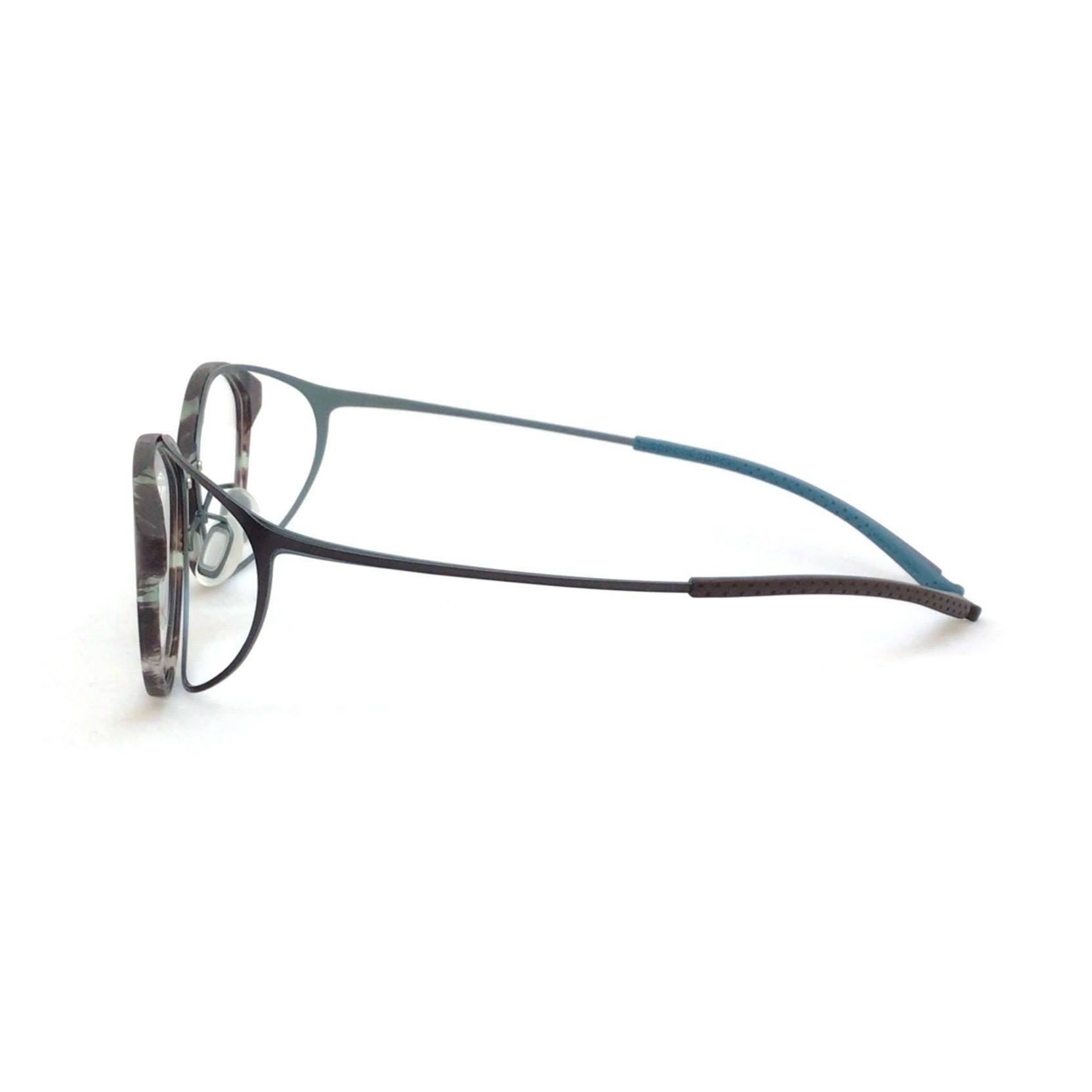 飽きのこないシンプルなボストンタイプのフレームです。 フロントには軽くて丈夫なナイロン樹脂素材が、 テンプルにはヒンジレス構造が採用されています。