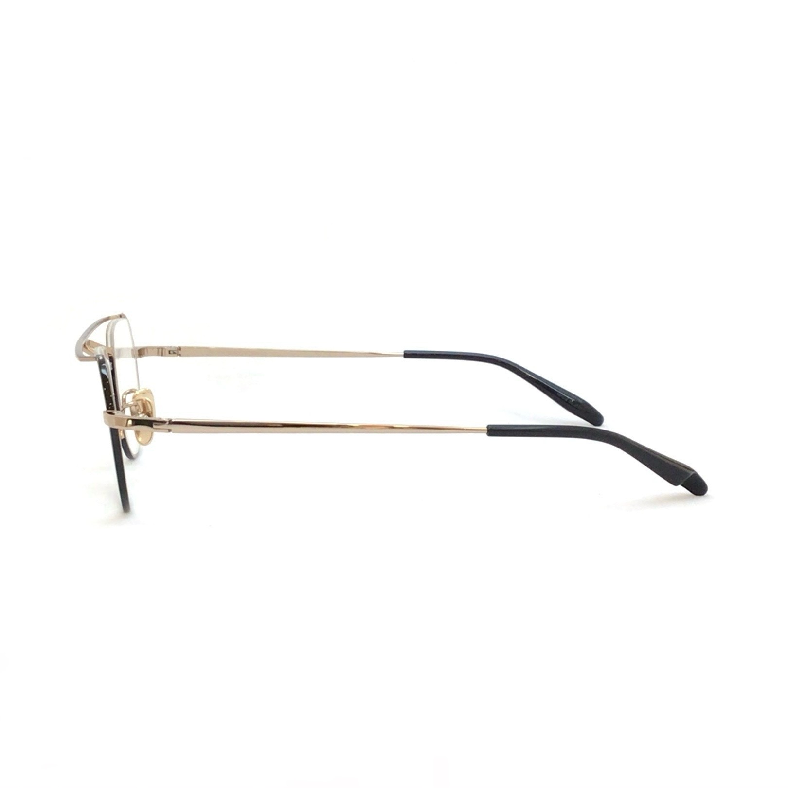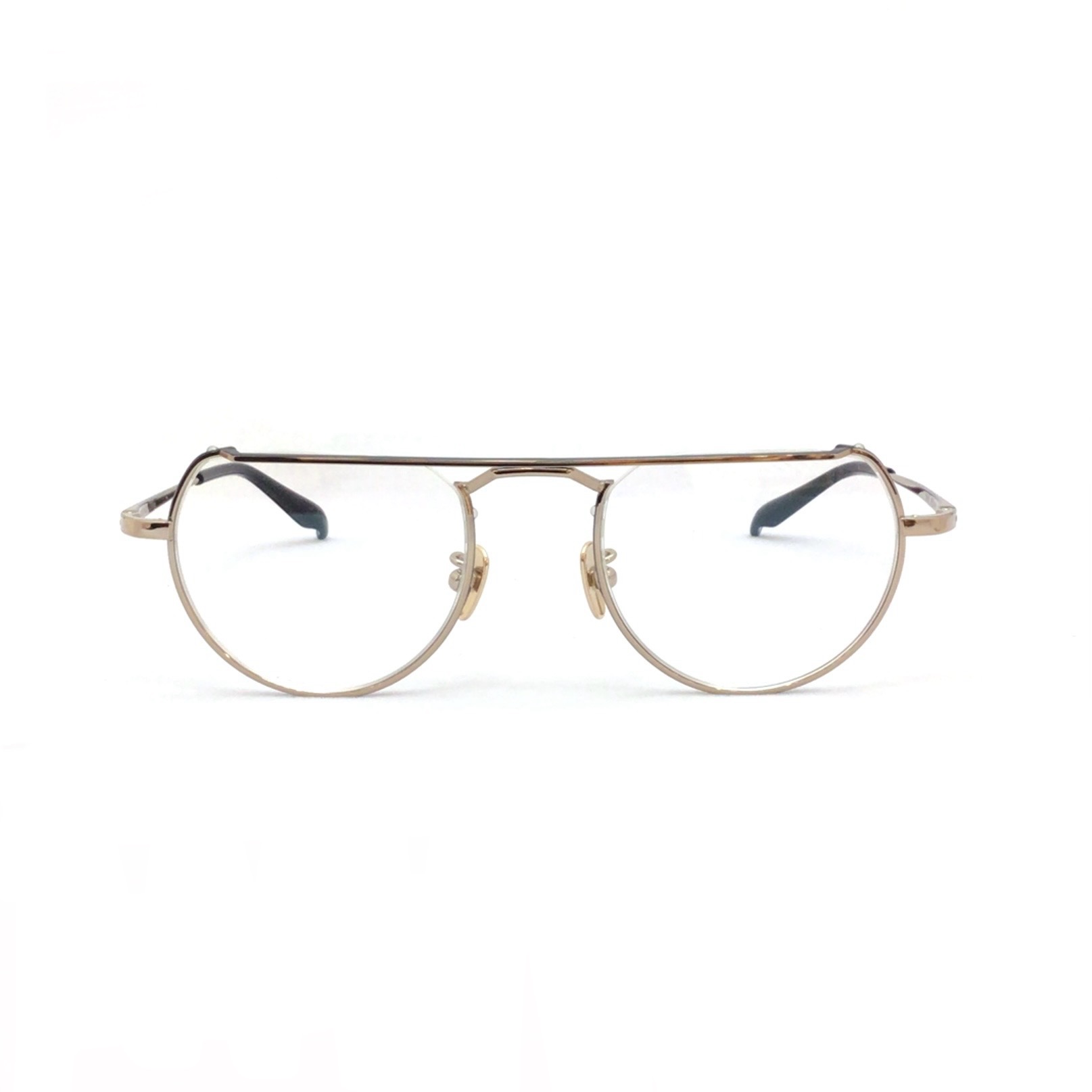 ラウンドタイプの上部を切り離したようなデザインです。 立体的なブローバーとハイブリッジが特長で、角度によって見え方が違って見えるフレームです。 正面からはゴールドですが、横顔や上から見た時にブラックカラーが見えるカラーリングです。