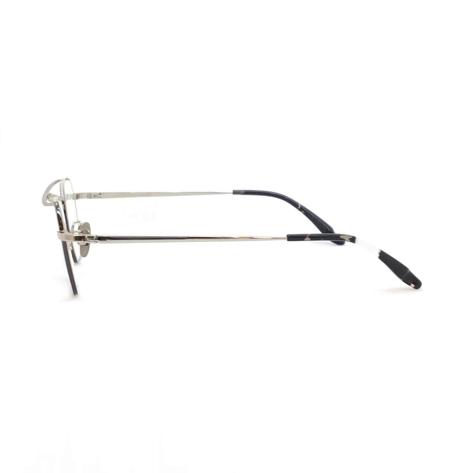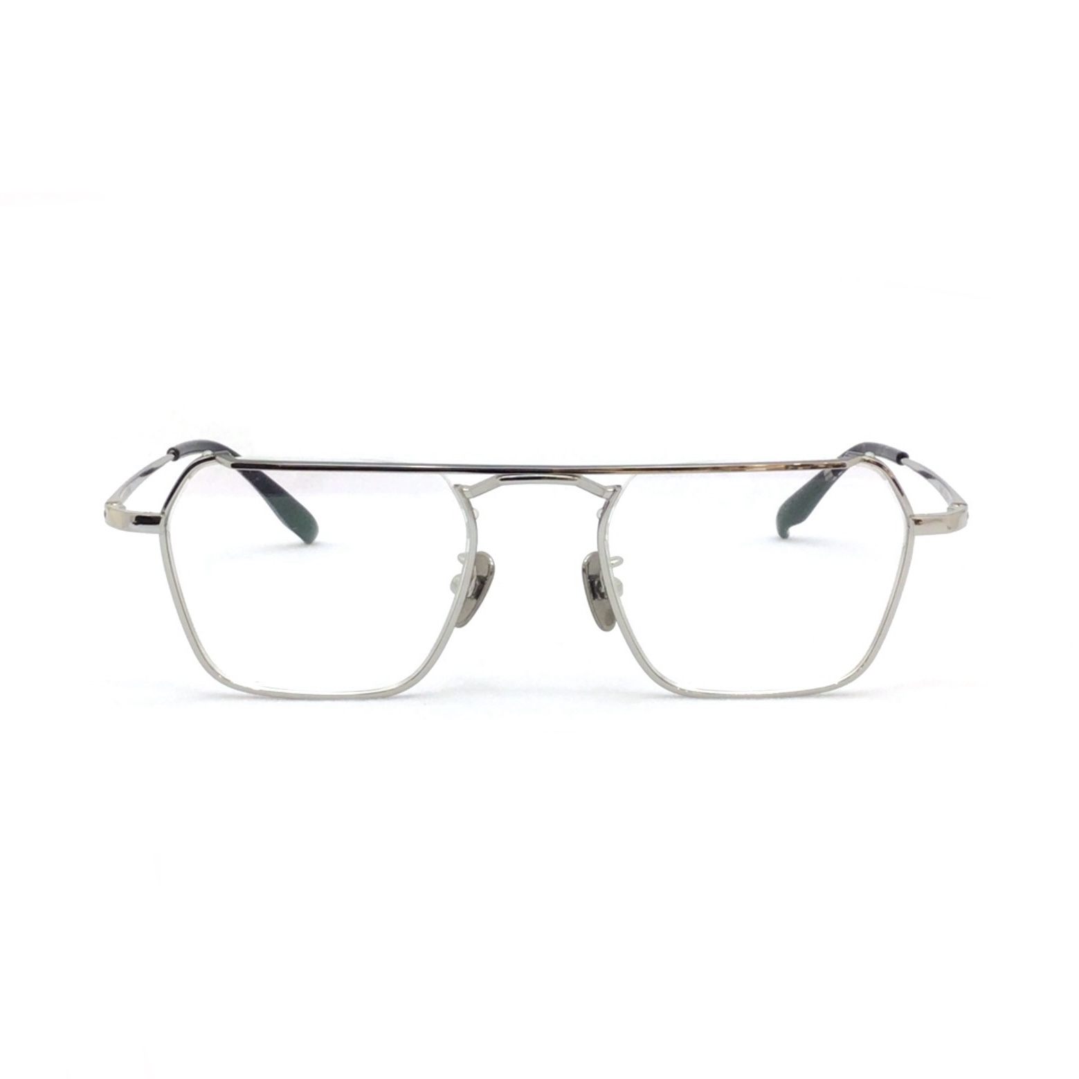 直線のブローバーが特徴的なヘキサゴンタイプのフレームです。 立体的な構造で見る角度により、表情が違って見えるデザインです。 正面はシルバーで横顔と上から見た時にグレーが見えるカラーリングです。